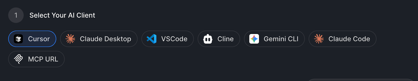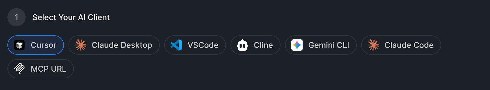 In the setup dashboard, you’ll see options like: Cursor, Claude Desktop, VSCode, Gemini CLI, Claude Code, Cline, or even custom MCP URLs.