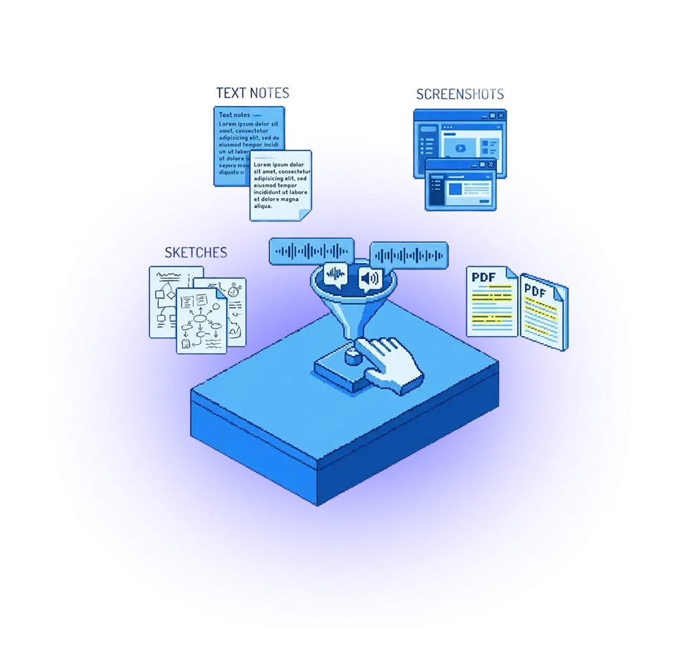 Users capture everything — web pages, PDF highlights, screenshots, audio notes, meeting recordings, sketches.
